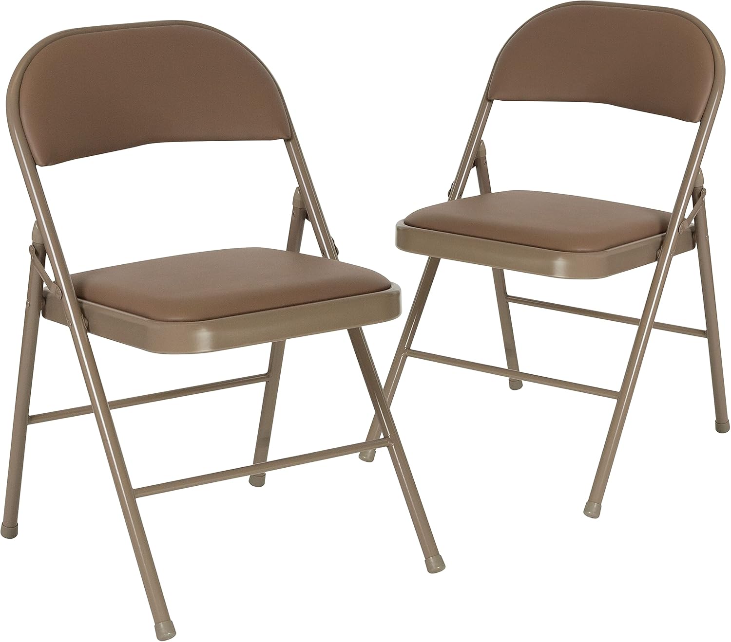 When your guest brings a surprise plus one handle the situation with ease by pulling out this classic metal folding chair with vinyl upholstery. This folding chair is built for everyday or occasional use in your business or home. The padded folding chair is upholstered in beige vinyl that is easy to clean and coordinates seamlessly with the frame. Its 18-gauge curved steel frame is double braced with legsupport bars to hold up to 600 pounds static weight capacity while the non-marring floor glides protect your flooring from scuffs and scrapes. These portable folding chairs fold compactly to transport and store. Don't stay confined inside, take your social event outdoors and enjoy the weather, protect the frame from extreme moisture by storing indoors. These attractive chairs are a smart seating solution for your next business meeting or special event. With nothing to assemble these chairs come ready to service your needs.