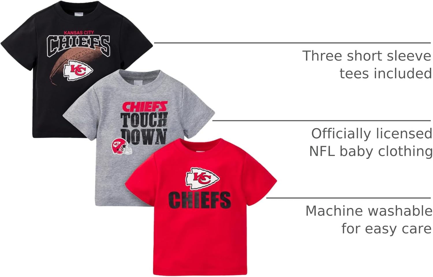 Get your little one ready to cheer, "Go, Team!". Even the smallest family members can get in the football spirit with our officially licensed NFL tees. This product contains Repreve® polyester made from recycled plastic bottles (or recycled content). Products made with Repreve help to conserve energy and natural resources. And, gives you another great reason to recycle. These tees feature comfy, casual crew necks to keep your little one comfortable throughout the entirety of the game (and the whole day long!). The screen print team logos are bright and bold, featured front and center on the t-shirts. They’re the perfect tees for warm game days and cool games days, as they may be worn comfortably all on their own or layered over to keep warm. These tees are machine washable to take care of any game-time spills with the utmost ease and convenience. This pack contains three tees.