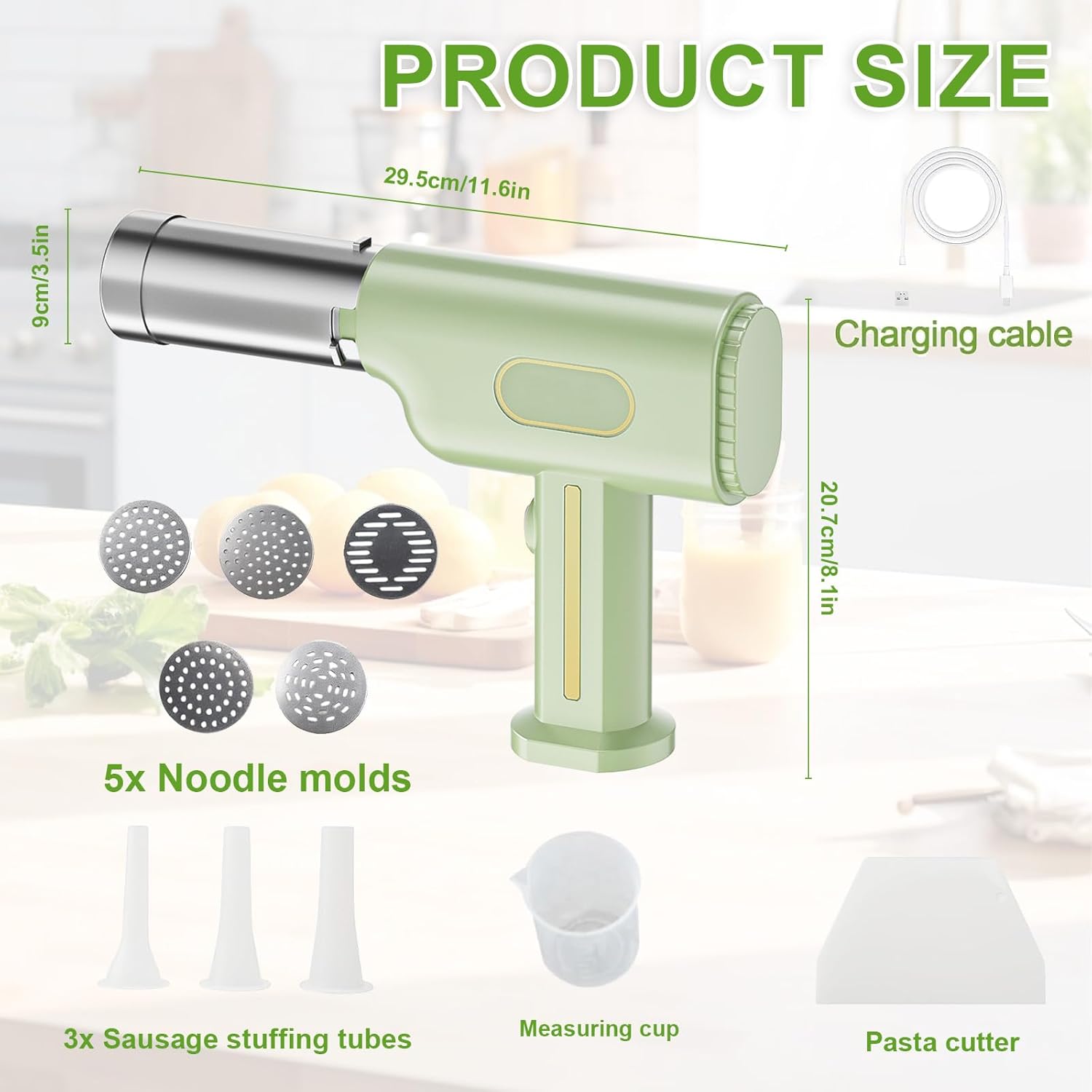 | Included Components | 1x dough holder tube, 1x main body, 1x measuring cup, 3x sausage stuffing tubes, 5x noodle molds |