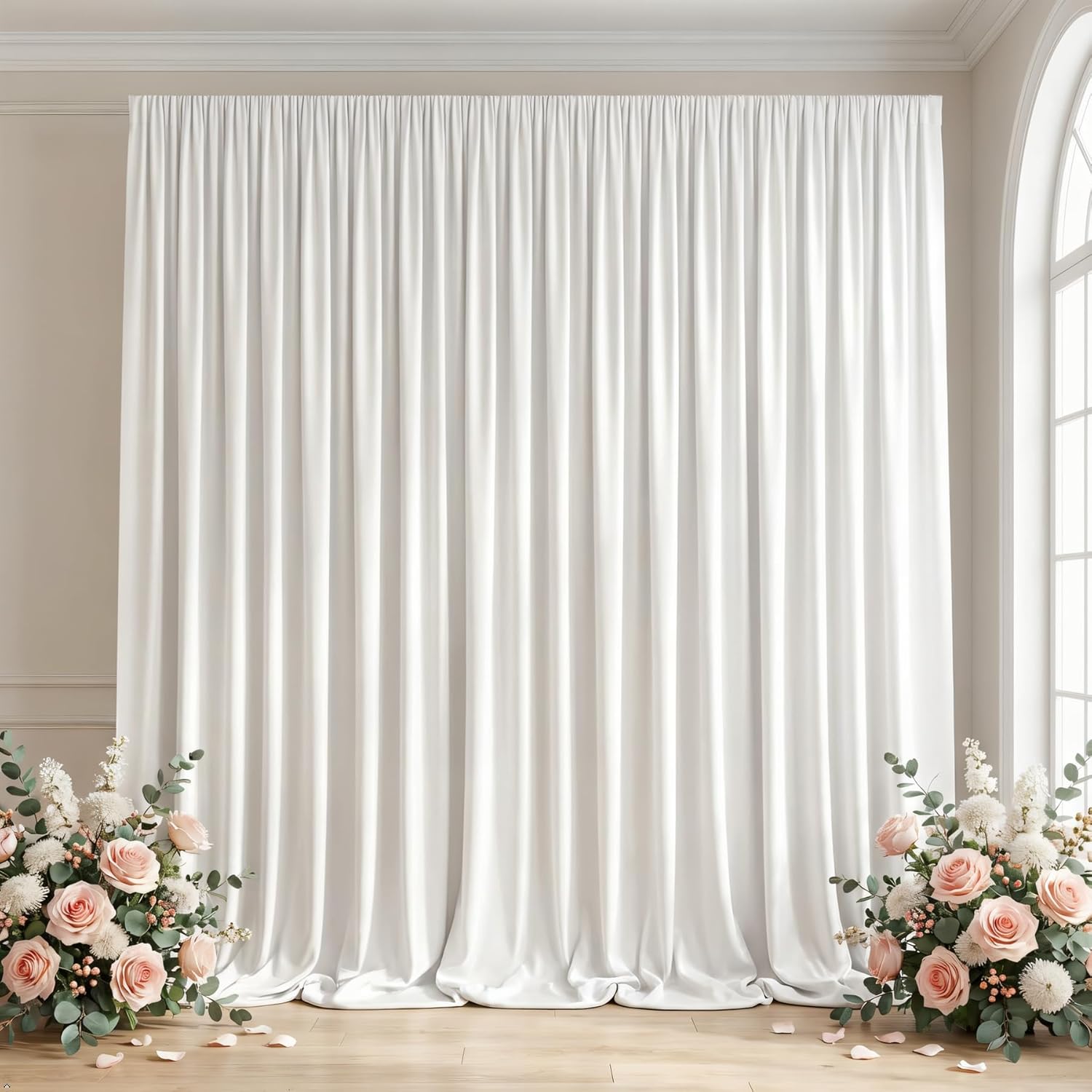 HAEFOO Premium White Backdrop Curtain: Your Ultimate Event Solution Create magazine-worthy moments with our 10x10ft white backdrop curtain – the essential canvas for photographers, event planners, and DIY enthusiasts. Designed as versatile draping fabric for both professional photo backdrops and breathtaking party decorations. Unrivaled Fabric Technology Experience luxury with our 100% polyester fabric – engineered for wrinkle-free elegance and stain resistance. The semi-opaque, unlined material drapes like liquid silk, creating a polished backdrop for weddings, birthday decorations, and studio photography. Use indoors as blackout curtains or outdoors as weather-resistant event drapery. Seamless Setup & Multipurpose Use Complete Coverage: 2 panels (5x10ft each) form a full 10x10ft curtain backdrop Easy Hanging: 6.2-inch rod pocket fits standard backdrop stands, pipes, or frames Endless Applications: Pipe and drape divider, birthday party backdrop, wedding ceremony accent, photo studio background, drop cloth, or outdoor curtainsCelebrate Every Occasion From baby showers and Christmas parties to YouTube videos and Halloween haunts, these white drapes for backdrop adapt to any theme. Photographers praise its matte finish for studio backdrops; brides love it for ethereal wedding decorations. The machine-washable fabric renews after every use – simply hang to restore its flawless drape.Technical Excellence Material: 100% heavyweight polyester (single layer, unlined) Opacity: Semi-opaque optimal light diffusion Care: Machine wash cold, tumble dry low (no bleach) Compatibility: Works with all standard backdrop stand systemsYour Event Perfected HAEFOO’s backdrop curtains for parties make elegance effortless. Invest in professional-grade decor that travels from photo shoots to parties to daily use!