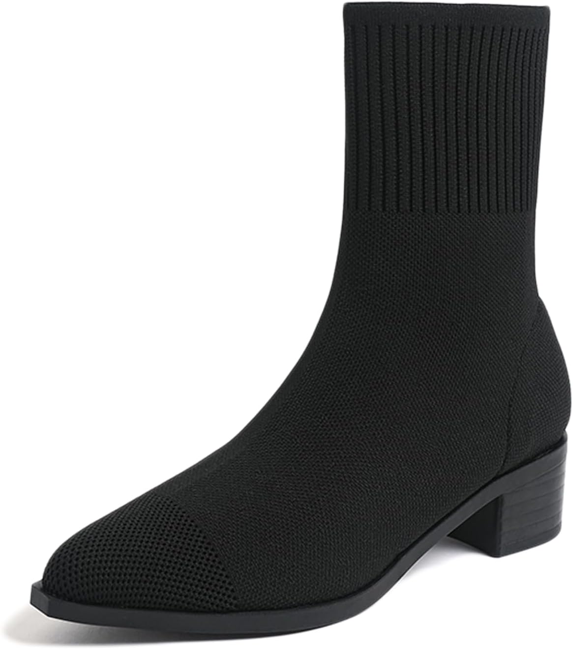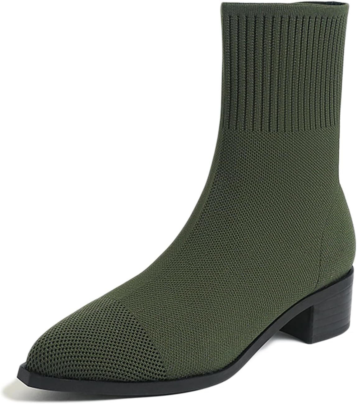 Knit Elastic Ankle Boots for Women's Chunky Block Heel Stretchy Sock Booties Sexy Slim Pointed toe Low heeled Casual Fall Winter Lightweight Chelsea Short Boots