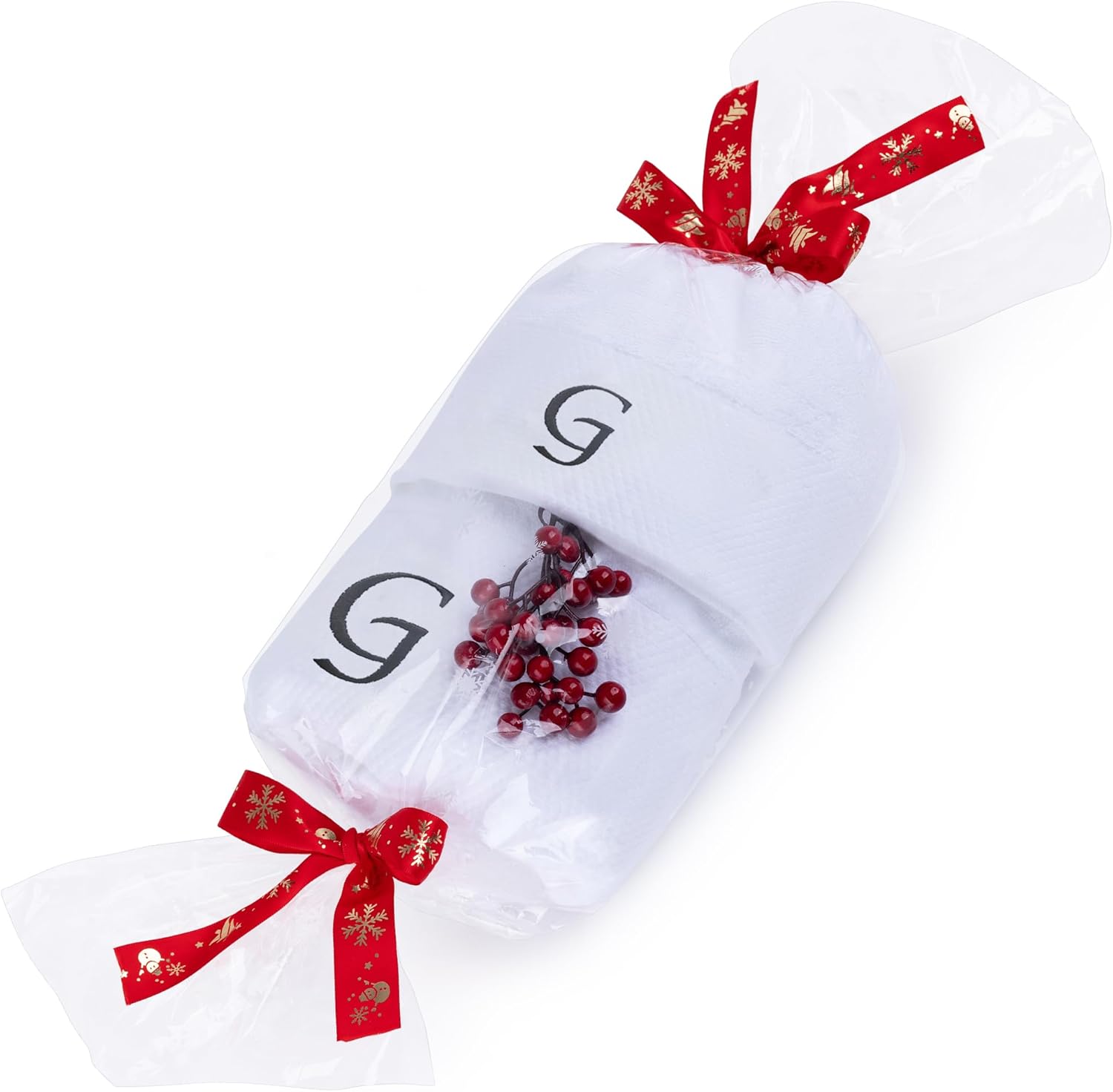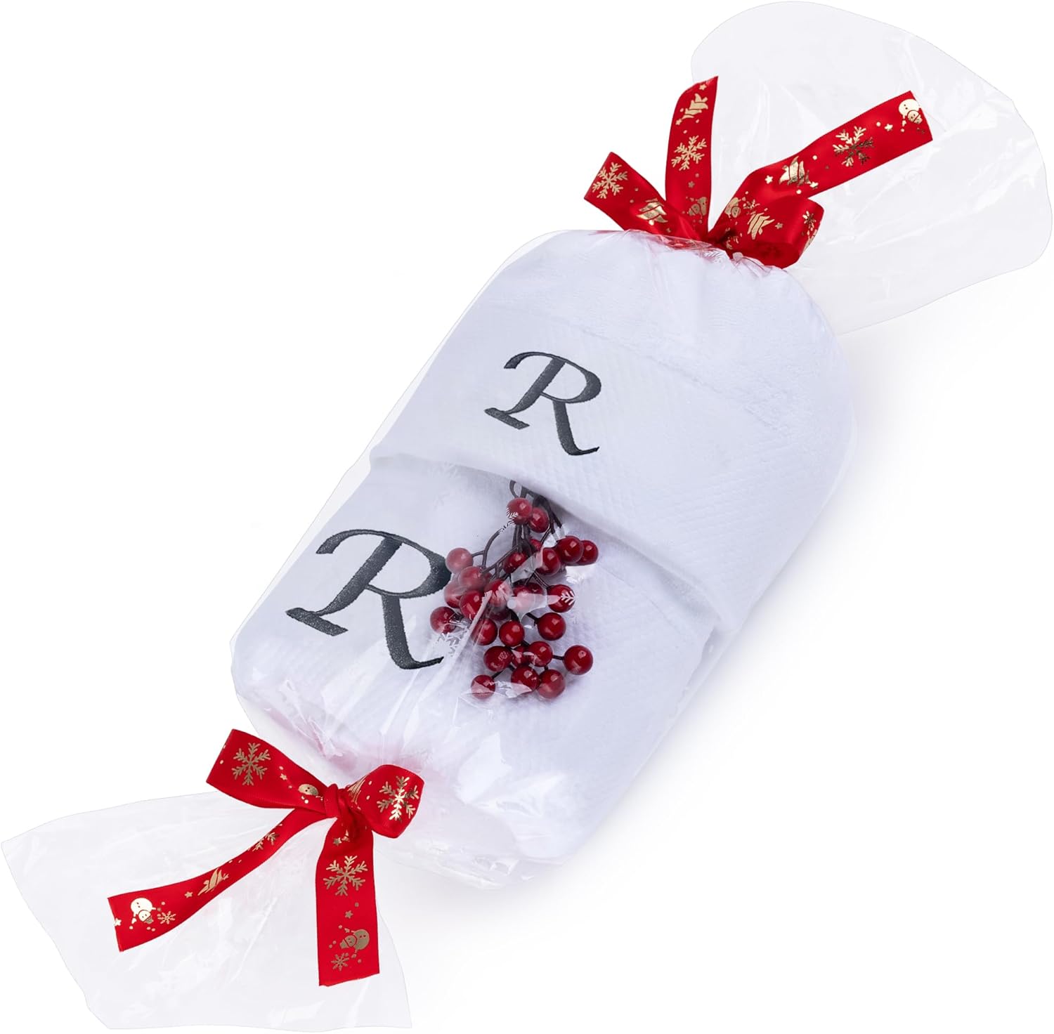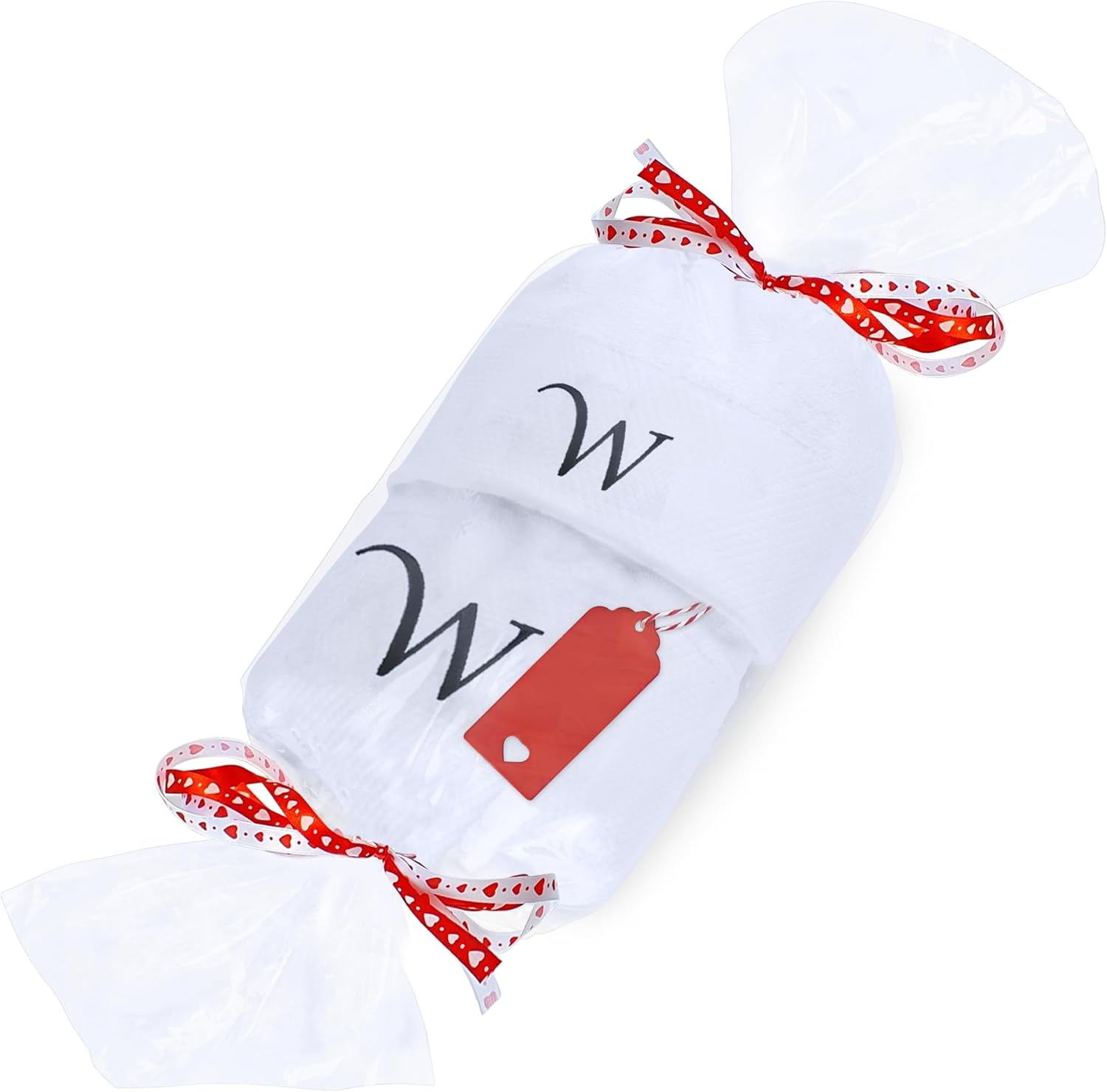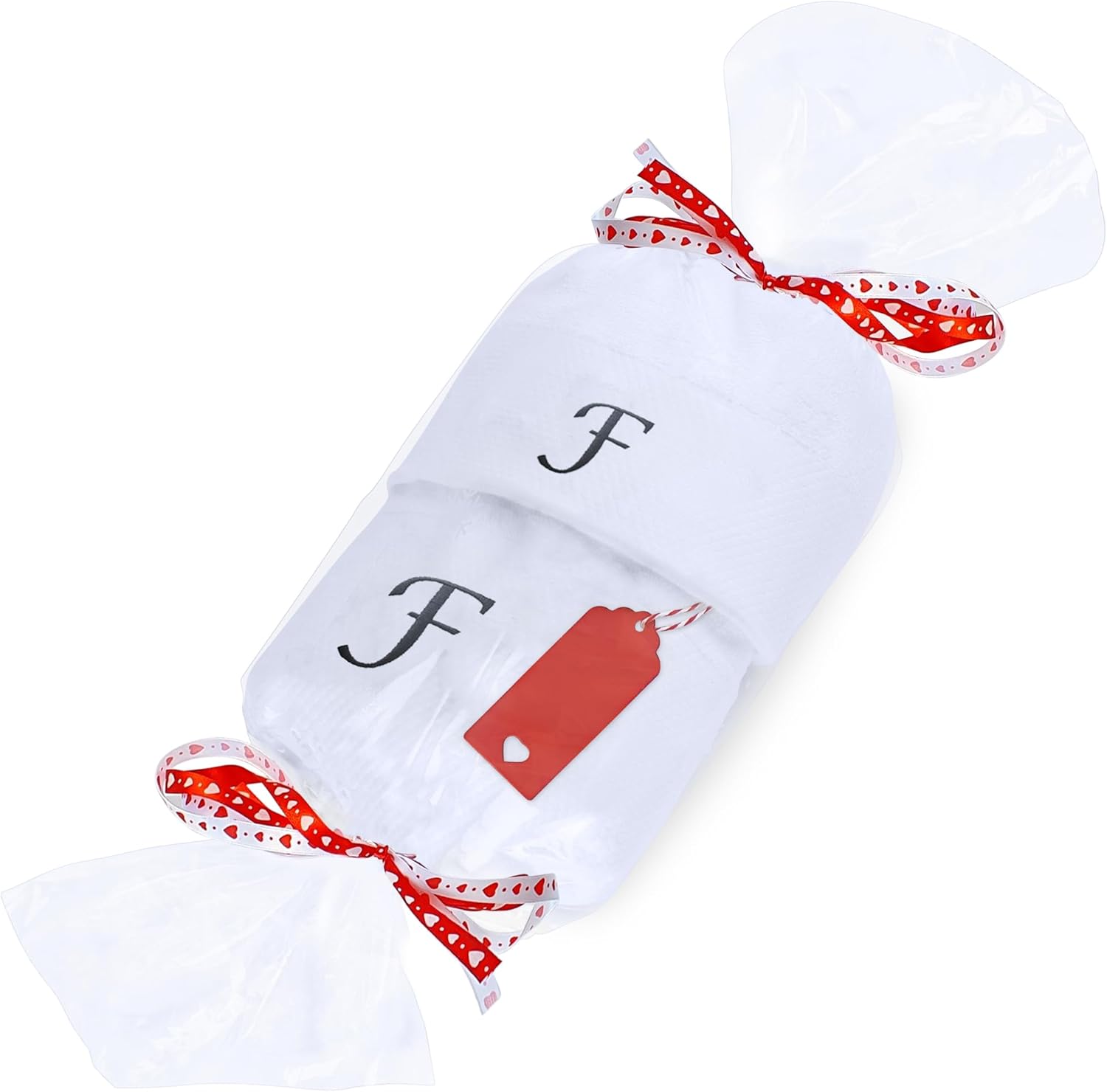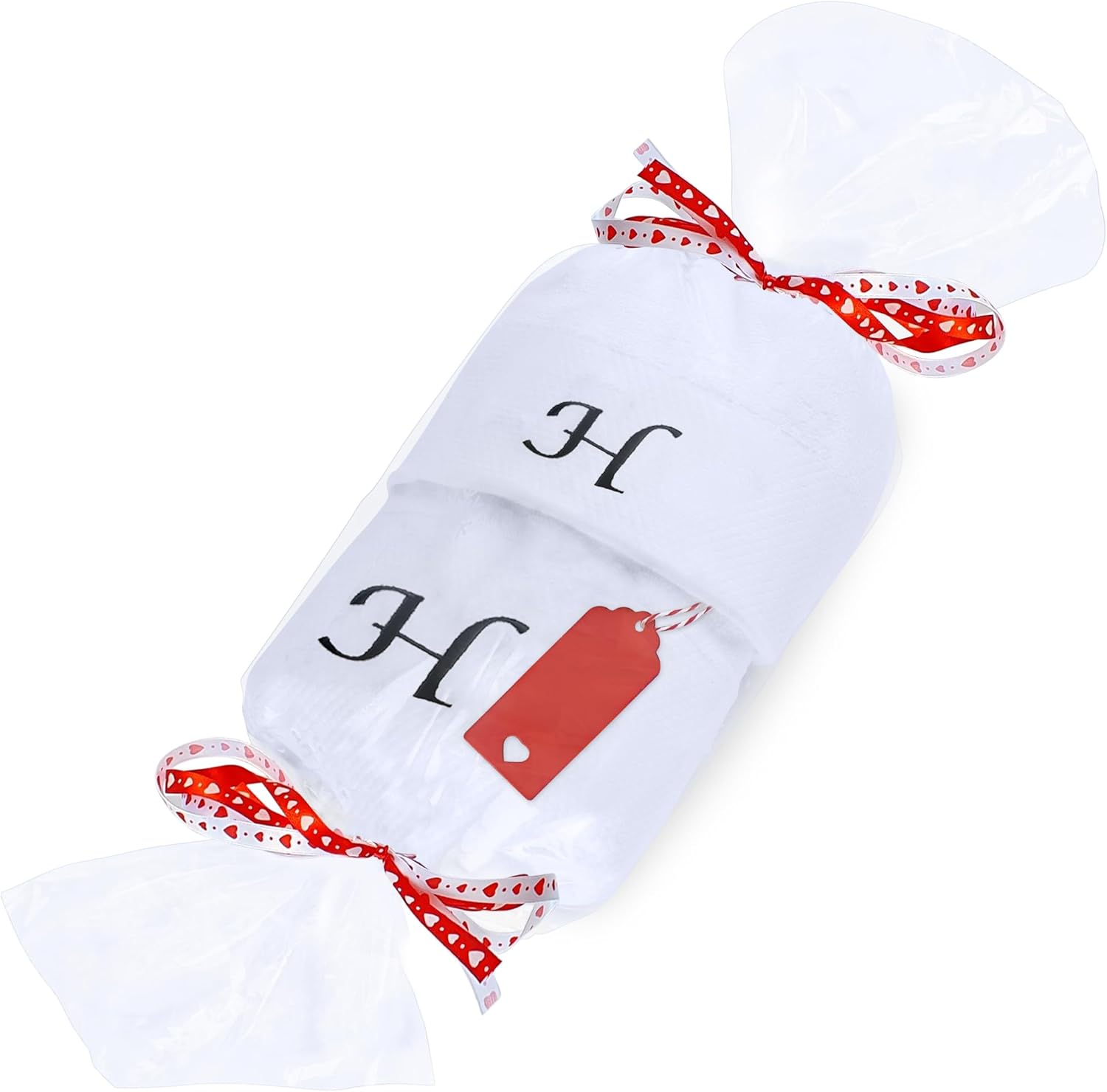 Embroidered Initial Towels Set for BathroomUnwrap a world of comfort and personalization with our exquisite set of four initial hand towels for the bathroom. Whether you're pampering yourself at home, drying off after a refreshing swim, or basking in the sun on your honeymoon, these soft embroidered towels ensure a touch of elegance in every moment and will transform your daily shower routine into a spa-like experience. Moreover, they will elevate your bathroom décor, adding a touch of elegance that speaks about your style.Hand towels set features a custom monogram, embroidered with your initials to create a truly unique and personal touch. Presented in a beautiful gift box, this monogrammed towel set makes a thoughtful and unforgettable present for any occasion. Surprise couples, families, and friends with a gift that combines practicality with a touch of luxury.Comfy Quick-drying TowelsThe monogrammed towels for bathroom are made from high-quality cotton that allows for superior absorbency, so you won't be left feeling damp. These are durable and will retain their exceptional softness and absorbency even after repeated washing, providing comfort for years.Easy Washing for Lasting UseThis bath and hand towel set is suitable for machine washing ideally under cool water, wash separately with like colors. With proper care, these white bathroom towels will continue to envelop you in luxury for years to come.Gift Box Contains2x Bath Towels (28 x 52 inches)2x Hand Towels (13 x 29 inches)