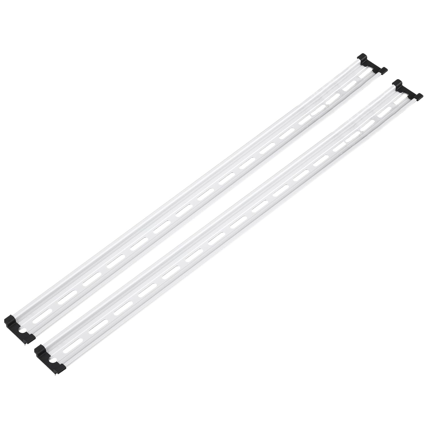 What is this?It is a guide rail widely used for a series of universal equipment installation of electrical and industrial products, such as circuit breaker, contactor, auxiliary relay, terminal block, power supply, etc.What will I get?Color: Silver ToneMaterial: AluminumOverall Size: 559x35x7.5mm/22x1.38x0.3inch(L*W*H)Thickness: 1mm/0.26";Oval Hole Size: 24x5mm/0.95x0.2 inch (L*W)Hole Center Distance: 34mm/1.34 inchPackage Content: 6 Pcs x DIN Rails + 12 Pcs Guide Rail CoverAre there any advantages of the product?Made of Aluminum, which is corrosion resistant and sturdy enough for long-time service. Screws pass through the mounting holes to fix the rail at a predetermined position, and the equipment is fixed on the rail through a standard structure to achieve the purpose of fast installation and disassembly.How to use it?Choose the appropriate rail according to the required length, and fix the caliper through the mounting holes arranged periodically on the rail.What should I notice?Insufficient materials and unreasonable structure will cause the caliper to be easily deformed by force, which may cause the parts installed on it to be loose easily.