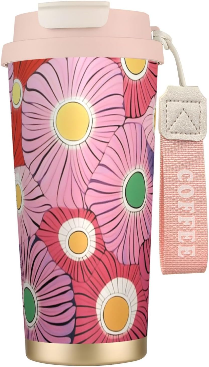 Pink flowers Experience the ultimate blend of style and functionality with our uniquely designed coffee mug. Perfectly suited for those who appreciate individuality, this 16 oz tumbler features a full-print, customized design that sets it apart from ordinary mugs. Made from top-grade 316 stainless steel on the inside and 201 stainless steel on the outside, along with a PP lid and straw, this mug is not only stylish but also incredibly durable.The superior insulation keeps your drinks at the desired temperature for more than 12 hours, ensuring you can enjoy your coffee, tea, or any other beverage no matter the weather. The ergonomic, tapered shape of the mug provides a comfortable and firm grip, making it easy to handle and carry. Whether you're on the go, relaxing at home, or working in the office, this versatile tumbler is the perfect companion.Additional features include a dual-drink lid, a convenient straw, and a sturdy nylon wrist strap for portability. The non-slip base adds an extra layer of security, keeping your drink stable on any surface. For cleaning, simply wash with water or wipe down; avoid using bleach or a dishwasher. Note that due to different measurement methods, a slight variation of 1-3 cm in size is considered normal.Make a statement with our unique, customized coffee mug, and elevate your drinking experience today!